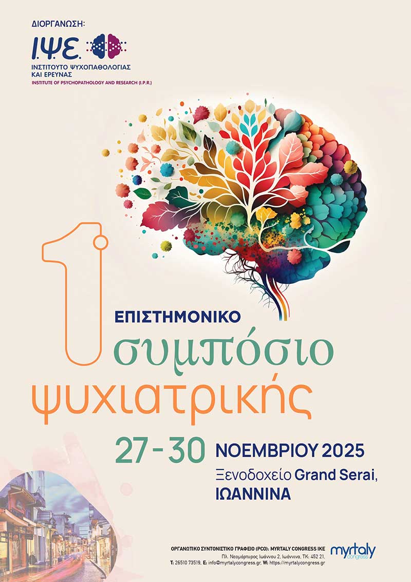 Με ιδιαίτερη χαρά και τιμή σας προσκαλούμε στο 1ο Επιστημονικό Συμπόσιο Ψυχιατρικής, που διοργανώνει το νεοσύστατο Ινστιτούτο Ψυχοπαθολογίας και Έρευνας (Ι.Ψ.Ε.) από τις 27 έως τις 30 Νοεμβρίου 2025 στην πόλη των Ιωαννίνων.