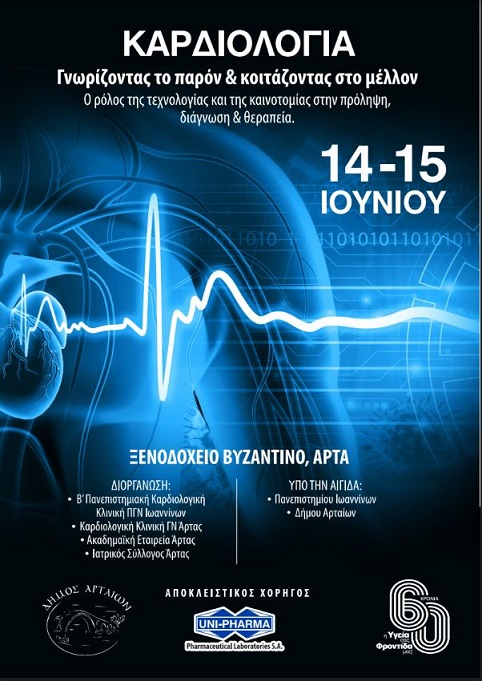 Στην Άρτα από το μεσημέρι ης Παρασκευής 14/6 έως το βράδυ του Σαββάτου 15/6, η Β Καρδιολογική Κλινική του Πανεπιστημιακού Νοσοκομείου Ιωαννίνων, η Καρδιολογική Κλινική του Γ Ν Άρτας, ο Ιατρικός Σύλλογος Άρτας και η Ακαδημαϊκή Εταιρεία Άρτας διοργανώνει στην Άρτα στο Ξενοδοχείο Βυζαντινό συνέδριο με τίτλο «Ο ρόλος της τεχνολογίας και της καινοτομίας στην πρόληψη, διάγνωση και θεραπεία των καρδιαγγειακών νοσημάτων”.