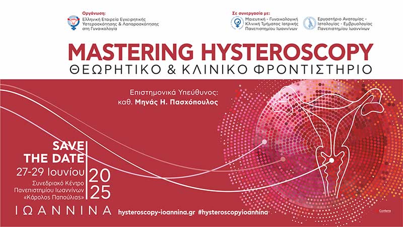 Με ιδιαίτερη χαρά σας καλωσορίζουμε στο 2ο Εκπαιδευτικό Θεωρητικό και Κλινικό Φροντιστήριο στην Υστεροσκόπηση με τίτλο “Mastering Hysteroscopy” το οποίο θα πραγματοποιηθεί στις 27 έως 29 Ιουνίου 2025 στο Συνεδριακό κέντρο του Πανεπιστημίου Ιωαννίνων “Κάρολος Παπούλιας”.